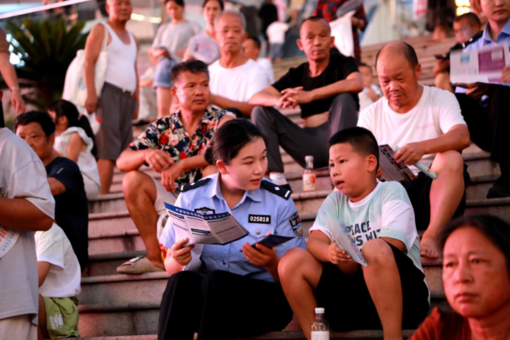 電影開場(chǎng)前,反詐、消防、反邪防邪的普法短片循環(huán)播放,畫面里的案例不是生硬的說教,而是街坊能聽懂的“家常話”;“法律風(fēng)險(xiǎn)大轉(zhuǎn)盤”前,孩子們踮腳搶答“防溺水要注意什么”,答對(duì)時(shí)接過的小禮品里,藏著《中華人民共和國(guó)民法典》的生活解讀;“法智大闖關(guān)”桌旁,老人們湊在一起研究“陌生鏈接能不能點(diǎn)”,工作人員遞上的宣傳冊(cè),把“刷單返利是騙局”的提醒印得明明白白。沒有單向灌輸?shù)目菰?,只有寓教于樂的互?dòng),正如參與市民所說:“在休閑中就把法律知識(shí)記牢了,在玩鬧中就把自我保護(hù)能力提升了?!碑?dāng)文化IP與普法相遇,法律便從“紙上條文”走進(jìn)了“茶余飯后”。