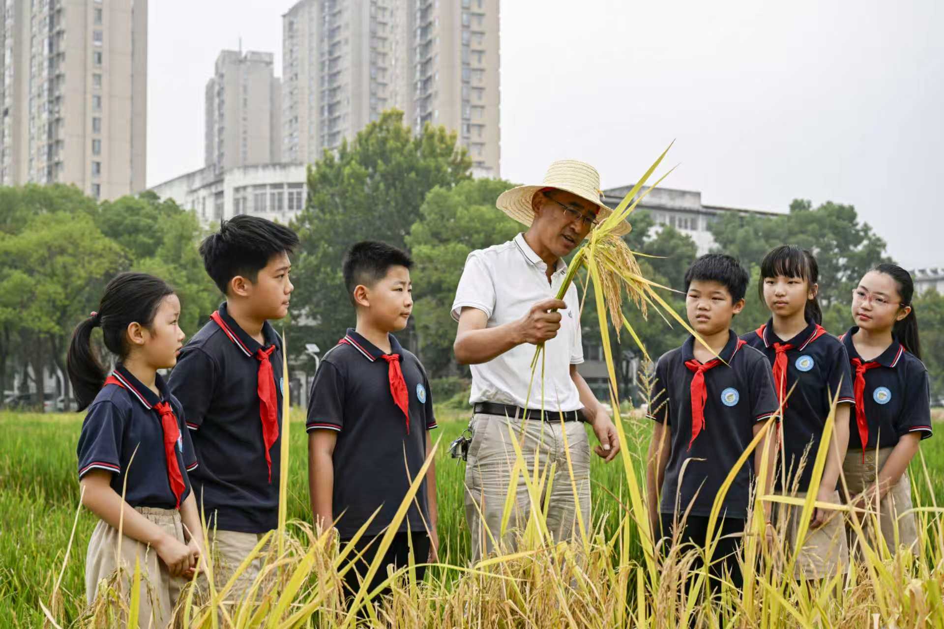 在省農(nóng)科院水稻所阮新民教授和合肥市四河小學(xué)黨支部副書記俞超的帶領(lǐng)下,孩子們走進試驗田,近距離觀察稻穗,學(xué)習(xí)辨別稻谷的成熟度和飽滿度。專家們系統(tǒng)地講解了水稻從育種、插秧、生長到抽穗的全過程,并介紹了功能稻、優(yōu)質(zhì)香稻等新品種的特性,讓同學(xué)們對現(xiàn)代農(nóng)業(yè)有了更直觀的認(rèn)識。