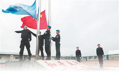 中國(guó)維和警察防暴隊(duì)營(yíng)區(qū)舉行升旗儀式。