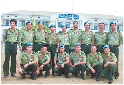 中國(guó)首批15名維和警察在東帝汶總統(tǒng)府前合影留念,后排右三為徐志達(dá)。