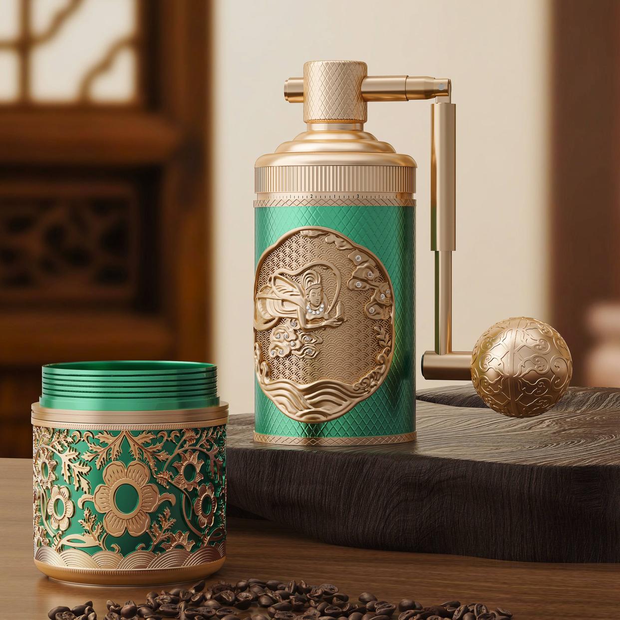 咖啡研磨器底部設(shè)計(jì)獨(dú)具匠心,其墨綠色咖啡粉倉(cāng)搭配黃金色石榴花卉卷草元素精心裝飾,不僅寓意吉祥圓滿、生生不息、循環(huán)永續(xù),還借由枝葉纏繞的形態(tài),巧妙傳遞出“和諧共生”的文化理念,象征著人與自然、人與人之間包容與聯(lián)結(jié)的美好愿景。