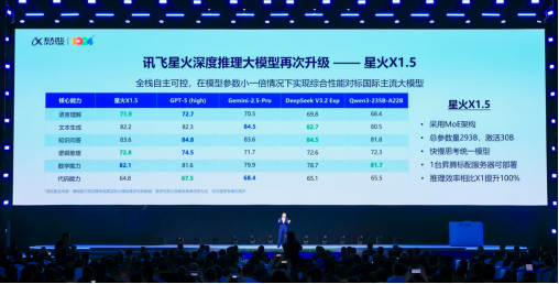 發(fā)布會(huì)上,深度推理大模型訊飛星火X1.5正式亮相。星火X1.5采用MoE架構(gòu),總參數(shù)量293B、激活30B,推理效率相比星火X1提升100%。它的語(yǔ)言理解、文本生成、知識(shí)問(wèn)答、邏輯推理、數(shù)學(xué)能力、代碼能力等六大核心能力全面對(duì)標(biāo)國(guó)際主流,其中數(shù)學(xué)能力持續(xù)保持國(guó)際領(lǐng)先。其多語(yǔ)言能力覆蓋超過(guò)130個(gè)語(yǔ)種,整體性能達(dá)到GPT-5的95%以上,其中拉美、東盟等14個(gè)重點(diǎn)語(yǔ)言效果領(lǐng)先,為世界提供了AI發(fā)展的“第二選擇”。