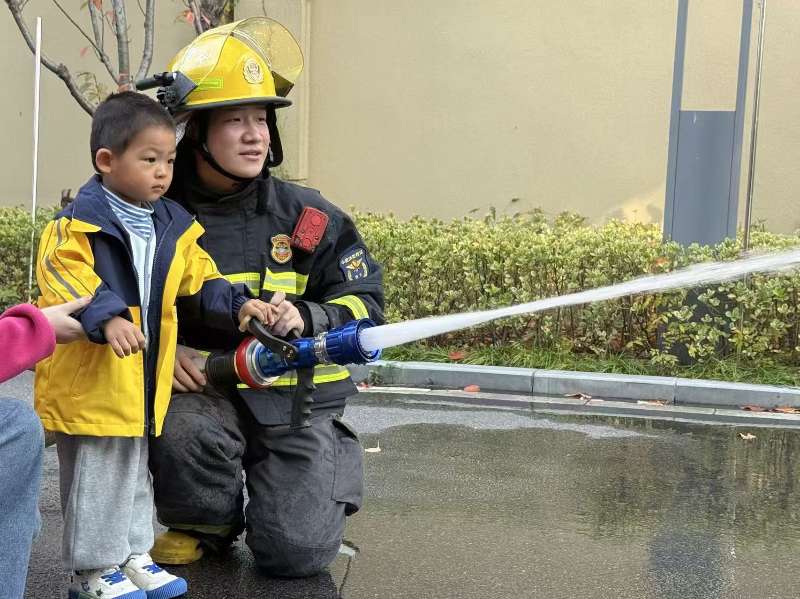 紅色的消防救援車緩緩駛?cè)胗變簣@,引發(fā)了孩子們陣陣歡呼。在消防員叔叔的引導(dǎo)下,孩子們與這個(gè)“紅色巨人”進(jìn)行了零距離接觸:他們不僅參觀了消防車內(nèi)的各種裝備,還認(rèn)真聆聽了消防員對(duì)消防器材、救援裝備的講解。高壓水槍、消防服、空氣呼吸器等這些以往只在繪本上看到的器械真實(shí)地呈現(xiàn)在眼前,讓孩子們興奮不已,在互動(dòng)體驗(yàn)中直觀地學(xué)習(xí)了消防知識(shí),心中也播下了敬畏火焰藍(lán)、關(guān)注消防安全的種子。