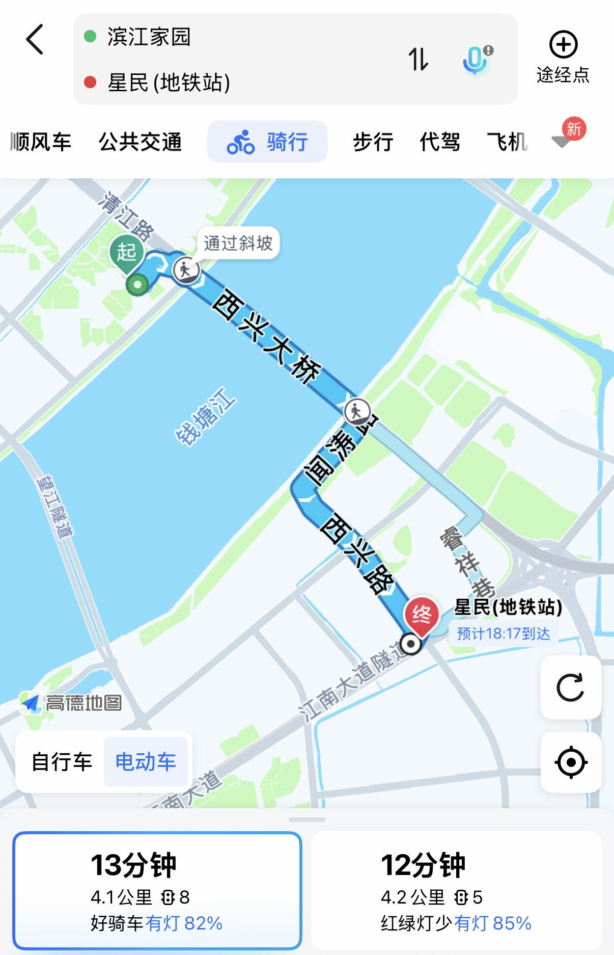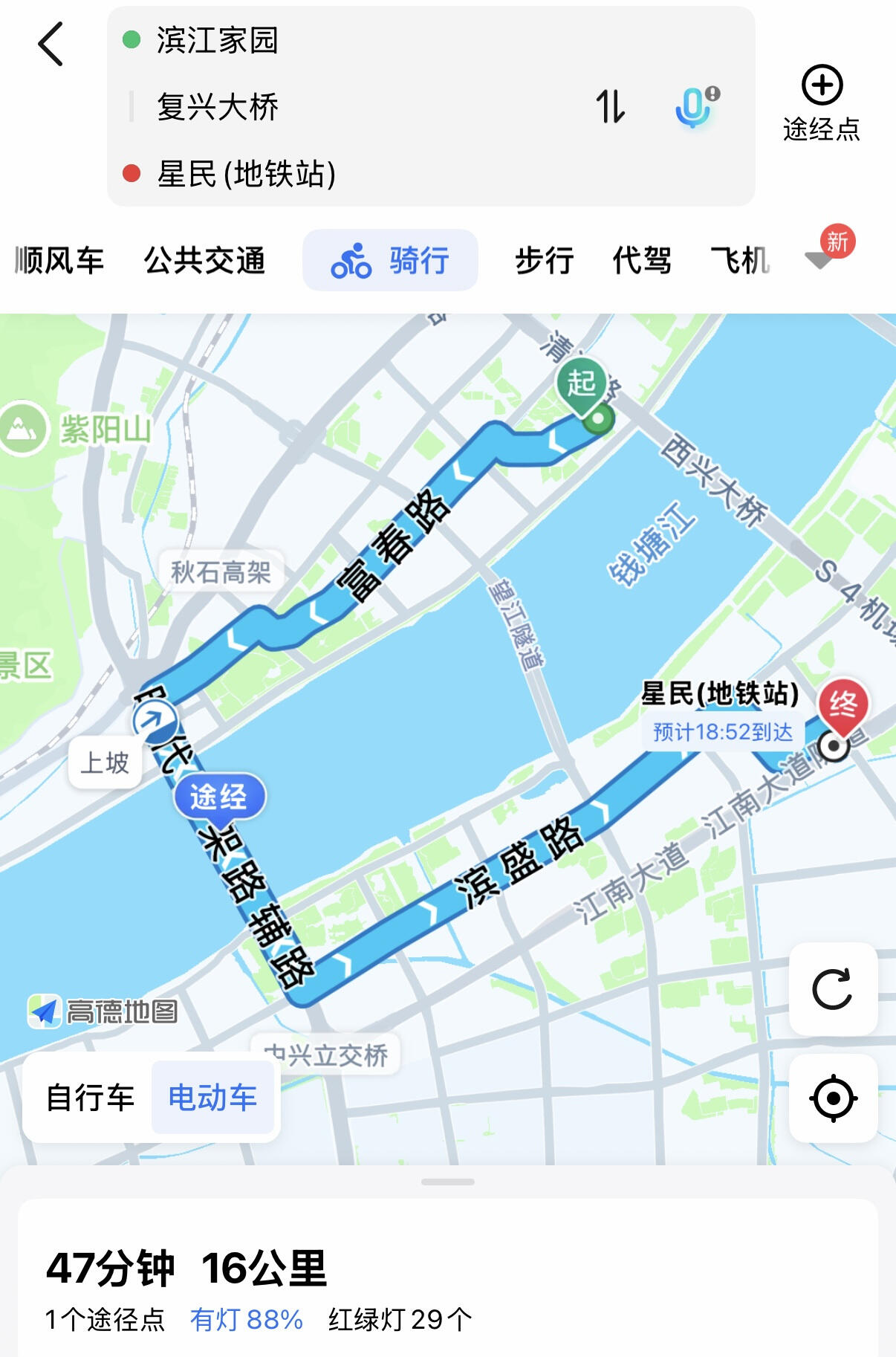 經(jīng)常開電瓶車或騎自行車過江的市民會發(fā)現(xiàn),若繞行,通勤路程可就遠了不止一倍。記者查詢發(fā)現(xiàn),原本電瓶車只需5-7分鐘即可通過錢江三橋,若繞行附近的復興大橋或彭埠大橋則路程增加約10公里,多耗時起碼半小時。