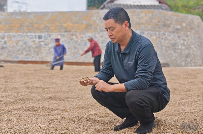 圖:興仁薏仁米產(chǎn)業(yè)有限公司董事長夏召和正在查看從農(nóng)戶收購來的薏仁米