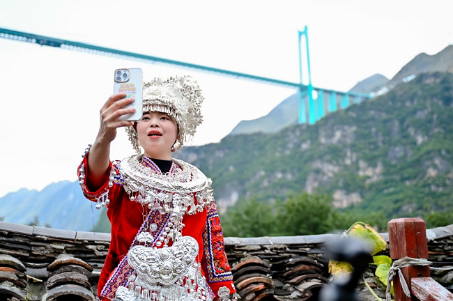 圖:小花江村村民通過5G網(wǎng)絡(luò)與網(wǎng)友分享大橋美景