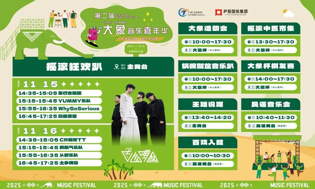 作為活力四射的“白天場”,第二屆大象音樂嘉年華將在杏花公園熱力開唱。當暖陽透過金黃的銀杏葉,主舞臺與民謠舞臺將共同奏響冬日交響。WhySoSerious、CR超燃π、白晝流星等8支搖滾樂隊將輪番炸場;民謠舞臺不僅有經典民謠演唱,還別出心裁融入“百戲入皖”戲曲元素,實現(xiàn)傳統(tǒng)與現(xiàn)代的碰撞。除了音樂主線,現(xiàn)場更鋪開了一幅美好的冬日創(chuàng)意畫卷。鍋碗瓢盆音樂趴、大象運動會、搖滾中醫(yī)市集、大象杯棋友賽等特色環(huán)節(jié)環(huán)環(huán)相接,加上備受關注的“王姐說媒”相親活動,為市民游客帶來耳目一新的娛樂體驗。本次活動免費向公眾開放,參與者還能與合肥經典地標逍遙津大象滑滑梯來場邂逅,解鎖廬陽文旅限定手辦。