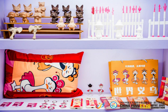 其中,“義脈鋒承”系列兵器筆引起了各國(guó)采購(gòu)商和嘉賓的濃厚興趣,大家對(duì)這種將傳統(tǒng)文化通過(guò)創(chuàng)新設(shè)計(jì)轉(zhuǎn)化為當(dāng)代用品的做法表示贊賞?!斑@不僅是一支筆,更是一段歷史的載體?!闭刮回?fù)責(zé)人周琳瑯老師向采購(gòu)商介紹說(shuō),“我們希望通過(guò)這樣的設(shè)計(jì),讓‘忠勇愛國(guó)、堅(jiān)韌不拔’的精神在新時(shí)代繼續(xù)傳承下去?!蓖瑫r(shí),今年上半年新推出的學(xué)生作品“義烏鵝”IP形象——“戊戊”(老板)和“伊伊”(老板娘)依然獲得了大量關(guān)注。該作品以駱賓王的《詠鵝》為基礎(chǔ),融合了婺劇臉譜基因與“雞毛換糖”的文化內(nèi)核,相關(guān)衍生品涉及抱枕、筆記本、手提袋、胸牌等,展現(xiàn)新時(shí)代義烏人銳意進(jìn)取的商貿(mào)姿態(tài)。此外,學(xué)生手作的結(jié)合了當(dāng)?shù)胤沁z文化的陶瓷、竹編產(chǎn)品也獲得了大量年輕人的青睞,紛紛前來(lái)詢價(jià)采購(gòu)。