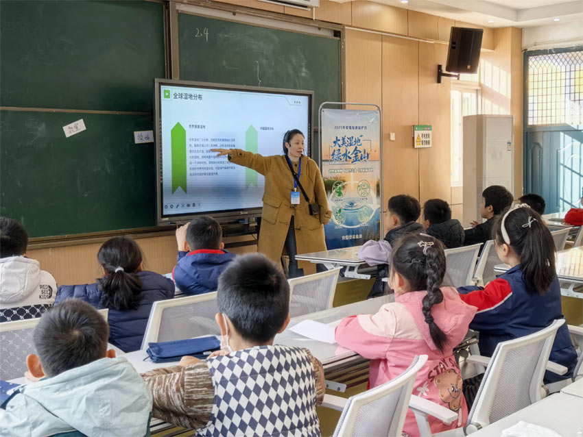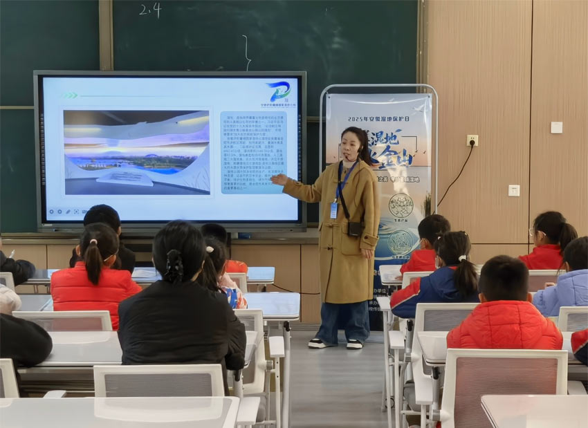 “大家知道嗎?我們董鋪濕地公園里生活著小天鵝、虎紋蛙這樣的國家級保護動物?!卑不諒]陽董鋪國家濕地公園的工作人員侯衛(wèi)茹的話音剛落,教室里響起一陣驚嘆聲。