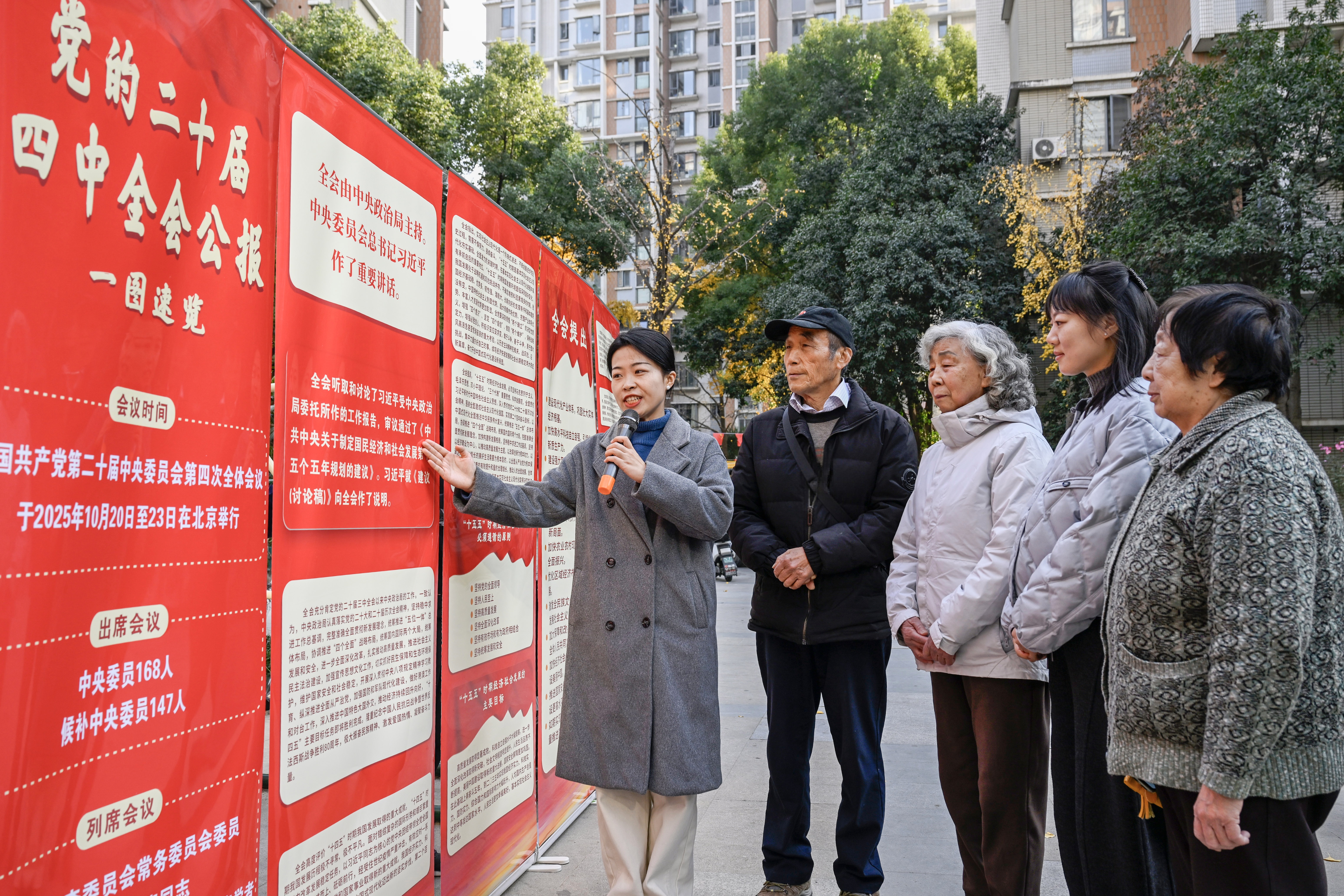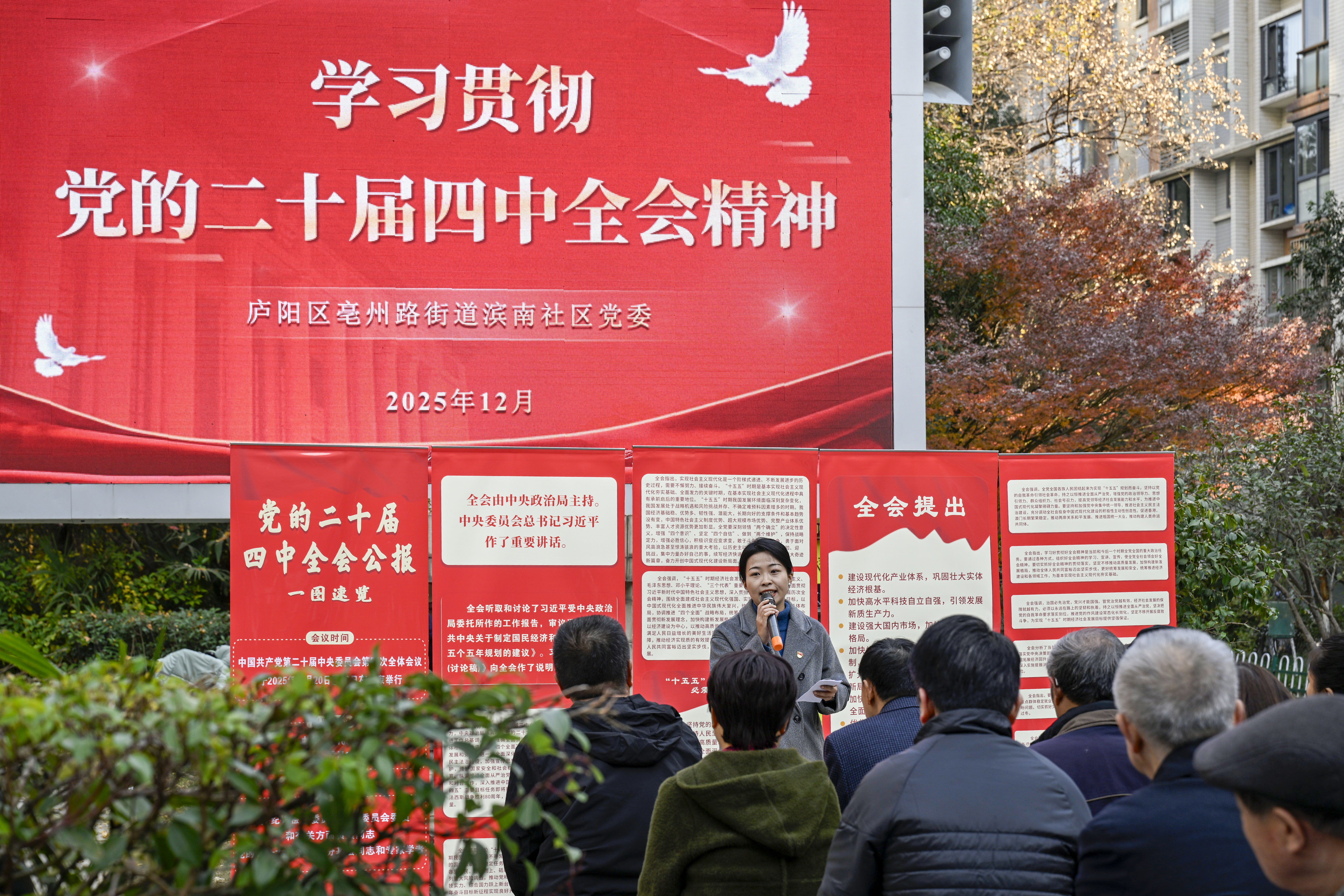2025年12月8日,在合肥市廬陽區(qū)亳州路街道濱南社區(qū)元一濱水城小區(qū)廣場上,學(xué)習(xí)貫徹黨的二十屆四中全會精神宣講活動正在這里熱烈開展。小區(qū)黨支部書記、街道紅星宣講團成員站在廣場中央,精神飽滿、聲情并茂地向居民們解讀著全會精神內(nèi)容。