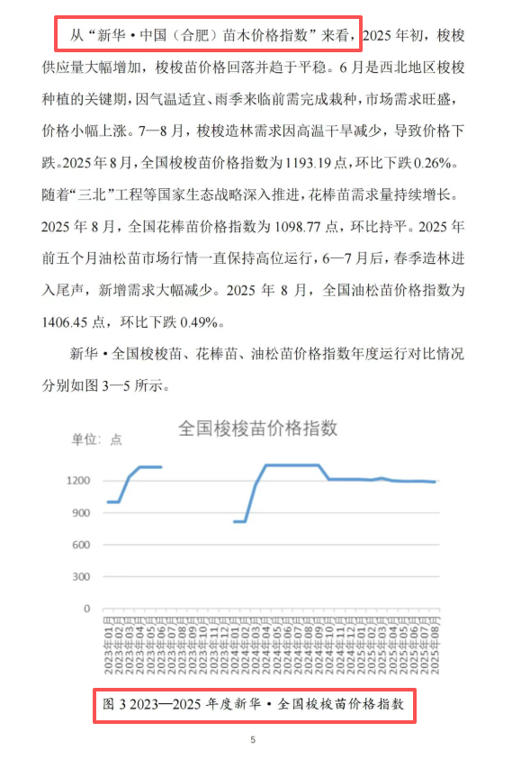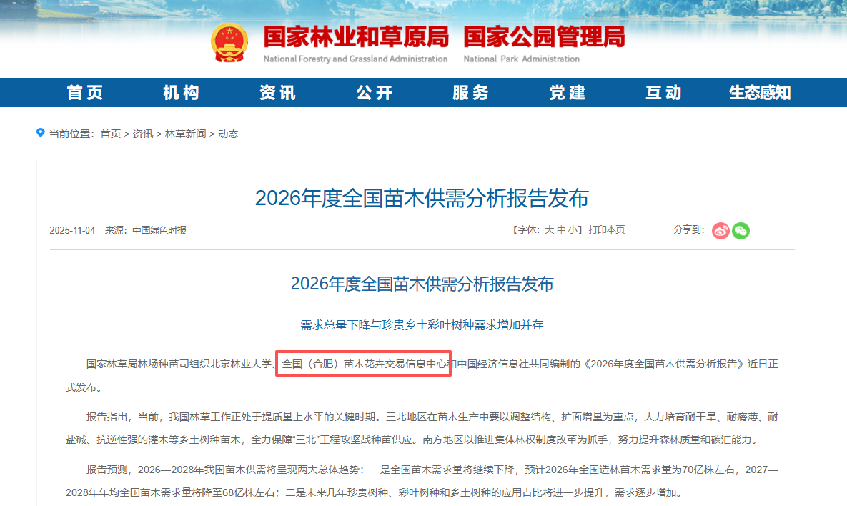 為有效緩解種苗供需結(jié)構(gòu)性矛盾,引導(dǎo)苗木生產(chǎn)經(jīng)營者合理安排生產(chǎn),推進(jìn)林草種苗事業(yè)高質(zhì)量發(fā)展,國家林業(yè)和草原局國有林場和種苗管理司組織北京林業(yè)大學(xué)、全國(合肥)苗木花卉交易信息中心和中國經(jīng)濟(jì)信息社,根據(jù)當(dāng)前我國國土綠化和生態(tài)保護(hù)修復(fù)的形勢與任務(wù),以及種苗生產(chǎn)實(shí)際情況,對(duì)2026年全國苗木供需情況進(jìn)行了分析,編制完成了《2026年度全國苗木供需分析報(bào)告》,于11月1日正式發(fā)布。肥西縣和中國經(jīng)濟(jì)信息社合作編發(fā)的新華?中國(合肥)苗木價(jià)格指數(shù)也是連續(xù)兩年被報(bào)告引用。
