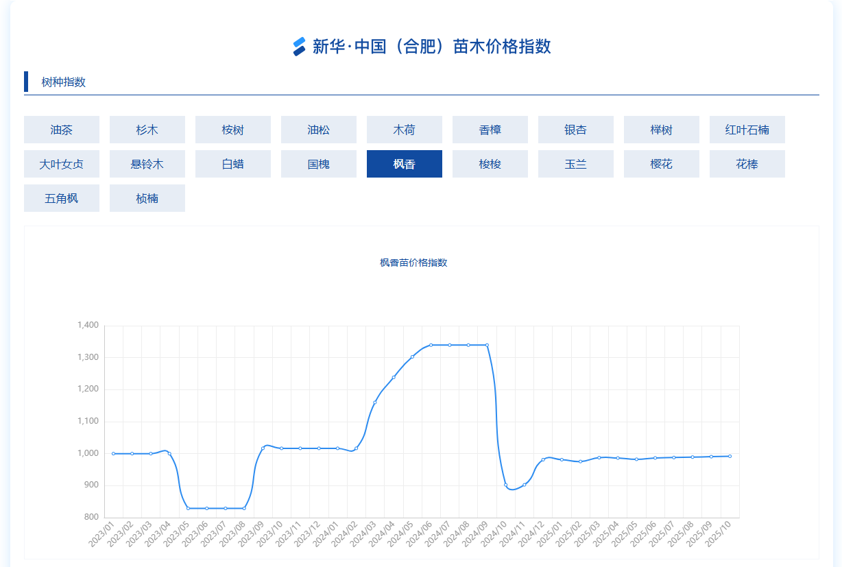作為國家級(jí)苗木價(jià)格監(jiān)測體系的核心工具,新華?中國(合肥)苗木價(jià)格指數(shù)已在中國?合肥苗木花卉交易大會(huì)、中國(蕭山)花木節(jié)、中國企業(yè)家博鰲論壇、廣西花博會(huì)等國家級(jí)會(huì)議平臺(tái)上累計(jì)發(fā)布運(yùn)行成果13次,在新華財(cái)經(jīng)、全國苗木花卉價(jià)格指數(shù)平臺(tái)上累計(jì)發(fā)布數(shù)據(jù)59期,共計(jì)樹種20個(gè),在全國16個(gè)省市自治區(qū)建立了約120個(gè)價(jià)格數(shù)據(jù)定向采集點(diǎn),成為反映市場動(dòng)態(tài)、引導(dǎo)生產(chǎn)交易的“風(fēng)向標(biāo)”。