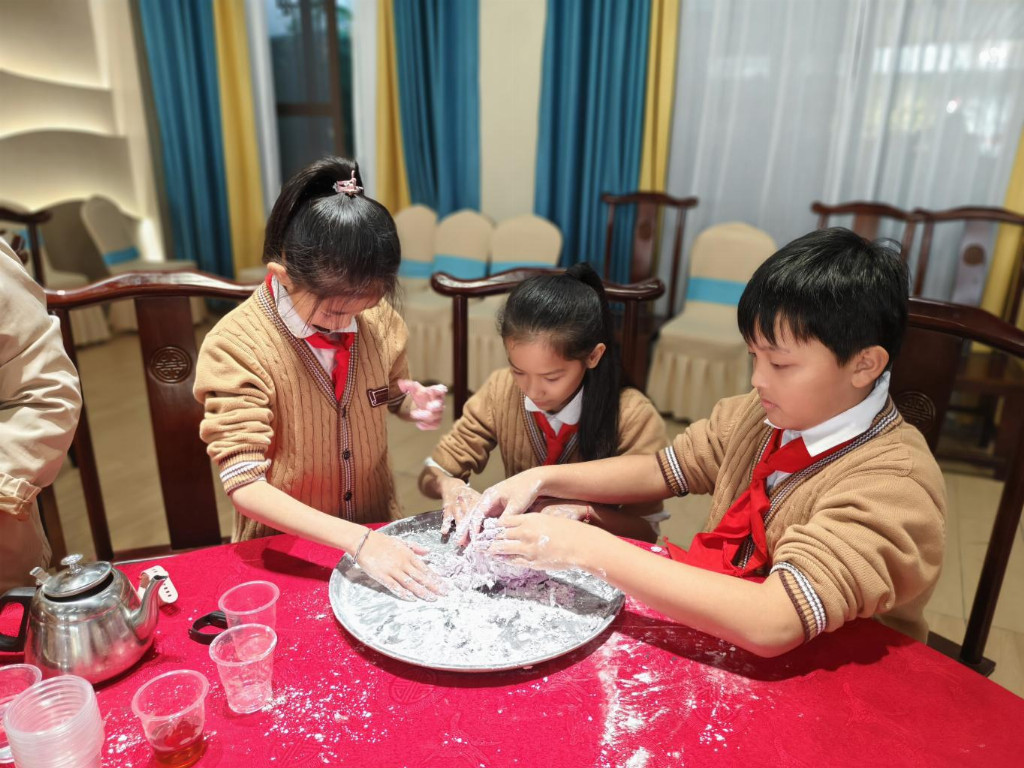 小學(xué)生揉紫薯面團制作湯圓(藥膳活動體驗)